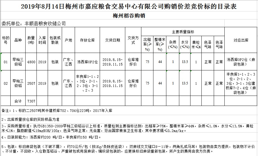 受客戶委托,梅州市嘉應(yīng)糧食交易中心有限公司定于2019年8月14日(星期三)舉辦稻谷購銷價(jià)差聯(lián)動(dòng)標(biāo)的交易會(huì),豐順縣糧食收儲(chǔ)公司擬銷售和采購早秈稻7307噸。