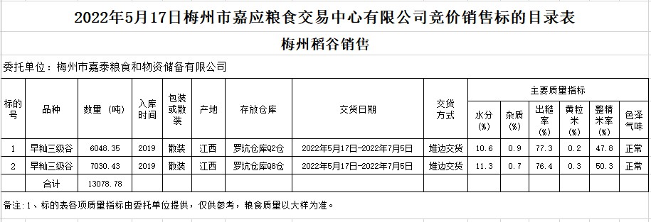 受客戶委托,梅州市嘉應(yīng)糧食交易中心有限公司定于2022年5月17日(星期二)舉辦糧食競(jìng)價(jià)交易會(huì)。梅州市嘉泰糧食和物資儲(chǔ)備有限公司擬銷售2019年早秈稻13078.78噸。