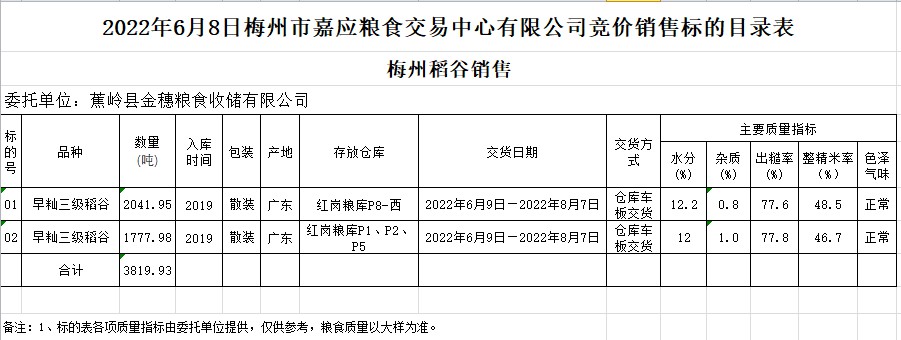 受客戶委托,梅州市嘉應(yīng)糧食交易中心有限公司定于2022年6月8日(星期三)舉辦糧食競(jìng)價(jià)交易會(huì)。蕉嶺縣金穗糧食收儲(chǔ)有限公司擬銷售2019年早秈稻3819.93噸。