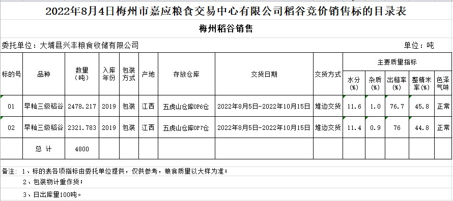 受客戶委托,梅州市嘉應(yīng)糧食交易中心有限公司定于2022年8月4日(星期四)舉辦糧食競價交易會。大埔縣興豐糧食收儲有限公司擬銷售2019年早秈稻4800噸。