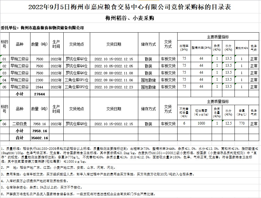 受客戶委托,梅州市嘉應糧食交易中心有限公司定于2022年9月5日(星期一)舉辦糧食競價交易會。梅州市嘉泰糧食和物資儲備有限公司擬采購2022年早秈稻27644噸、二級白麥7958.16噸。