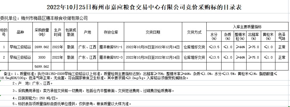 受客戶委托,梅州市嘉應(yīng)糧食交易中心有限公司定于2022年10月25日(星期二)舉辦糧食競價(jià)交易會(huì)。梅州市梅縣區(qū)穗豐糧食收儲(chǔ)有限公司擬采購2022年早秈稻5699.862噸。