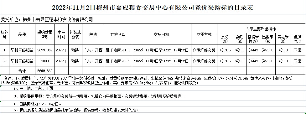 受客戶委托,梅州市嘉應(yīng)糧食交易中心有限公司定于2022年11月2日(星期三)舉辦糧食競價(jià)交易會。梅州市梅縣區(qū)穗豐糧食收儲有限公司擬采購2022年早秈稻5699.862噸。
