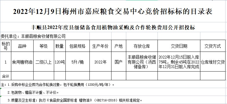 豐順縣2022年度縣級儲備食用植物油采購及合作輪換費用公開招投標(biāo)公告