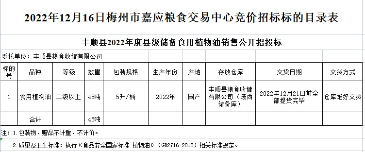 受客戶委托,梅州市嘉應糧食交易中心有限公司定于2022年12月16日(星期五)舉辦食用植物油競價交易會。豐順縣糧食收儲有限公司擬銷售2022年食用植物油45噸。