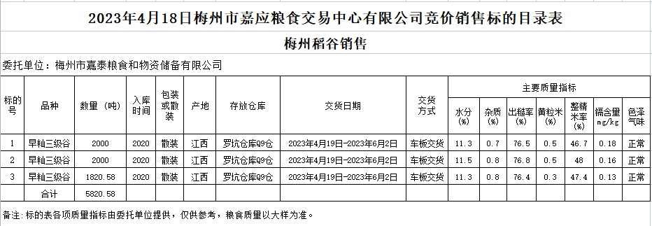 受客戶委托,梅州市嘉應(yīng)糧食交易中心有限公司定于2023年4月18日(星期二)舉辦糧食競價(jià)交易會。梅州市嘉泰糧食和物資儲備有限公司擬銷售2020年早秈稻5820.58噸。