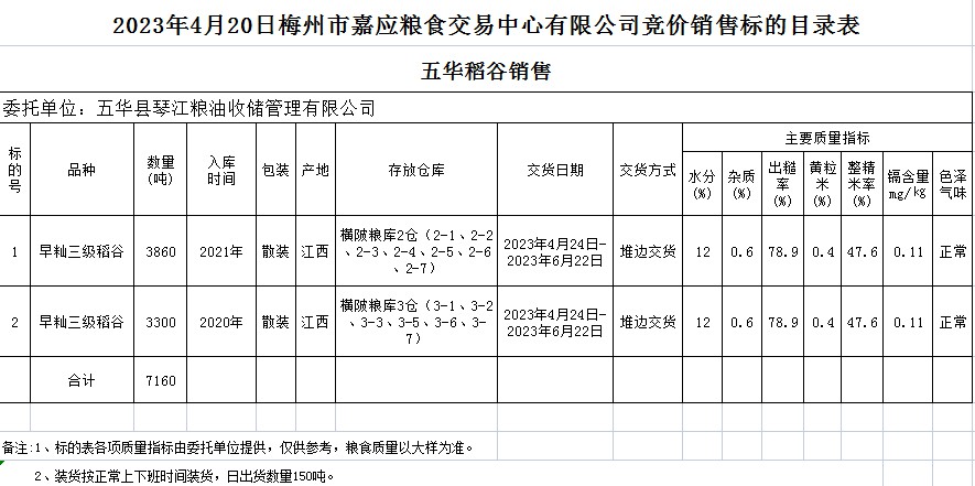 受客戶委托,梅州市嘉應(yīng)糧食交易中心有限公司定于2023年4月20日(星期四)舉辦糧食競價(jià)交易會(huì)。五華縣琴江糧油收儲(chǔ)管理有限公司擬銷售2020、2021年早秈稻7160噸。