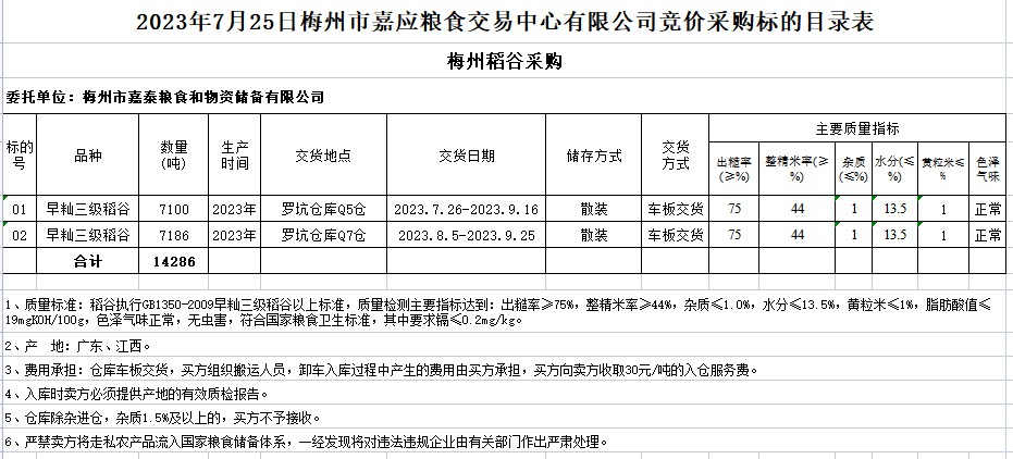 受客戶委托,梅州市嘉應糧食交易中心有限公司定于2023年7月25日(星期二)舉辦糧食競價交易會。梅州市嘉泰糧食和物資儲備有限公司擬采購2023年早秈稻14286噸。