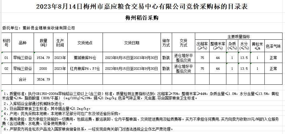 受客戶委托,梅州市嘉應(yīng)糧食交易中心有限公司定于2023年8月14日(星期一)舉辦糧食競價(jià)交易會(huì)。蕉嶺縣金穗糧食收儲(chǔ)有限公司擬采購2023年早秈稻3534.79噸。