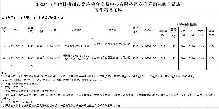 受客戶委托,梅州市嘉應(yīng)糧食交易中心有限公司定于2023年8月17日(星期四)舉辦糧食競價(jià)交易會(huì)。五華縣琴江糧油收儲(chǔ)管理有限公司擬采購2023年早秈稻7160噸。