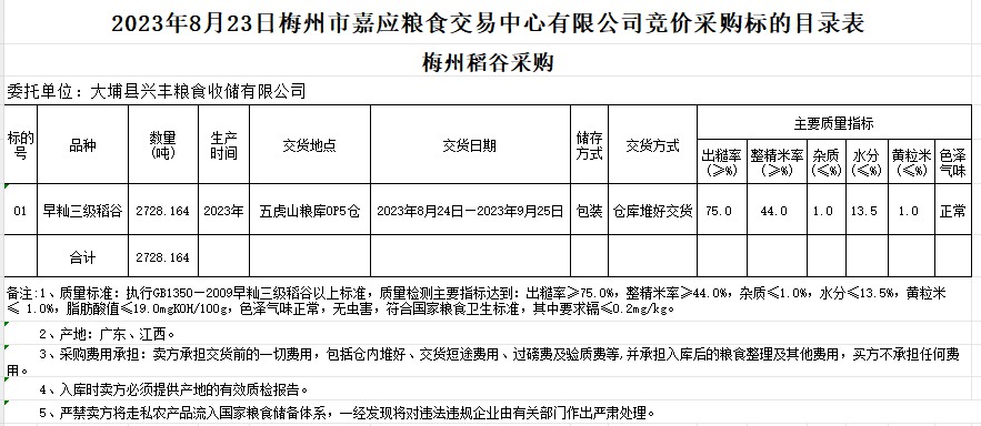 受客戶委托,梅州市嘉應(yīng)糧食交易中心有限公司定于2023年8月23日(星期三)舉辦糧食競價交易會。大埔縣興豐糧食收儲有限公司擬采購2023年早秈稻2728.164噸。