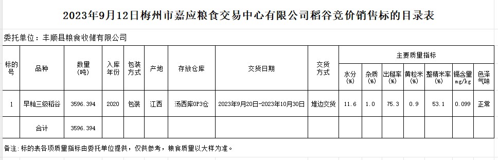 受客戶委托,梅州市嘉應(yīng)糧食交易中心有限公司定于2023年9月12日(星期二)舉辦糧食競價(jià)交易會(huì)。豐順縣糧食收儲(chǔ)有限公司擬銷售2020年早秈稻3596.394噸。