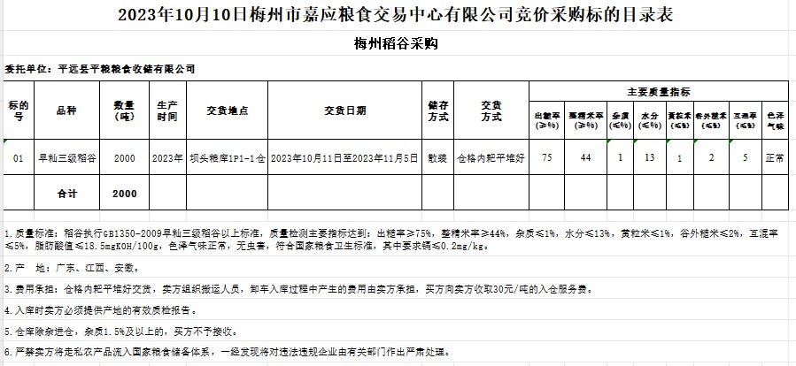 受客戶委托,梅州市嘉應糧食交易中心有限公司定于2023年10月10日(星期二)舉辦糧食競價交易會。平遠縣平糧糧食收儲有限公司擬采購2023年產(chǎn)早秈稻2000噸。