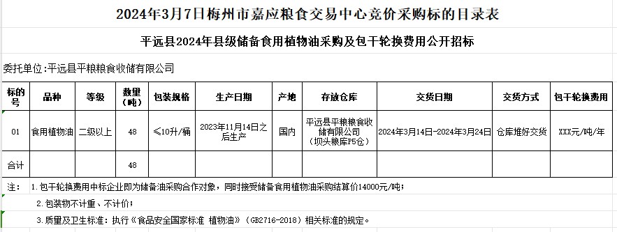 受平遠縣平糧糧食收儲有限公司委托,梅州市嘉應(yīng)糧食交易中心有限公司定于2024年3月7日(星期四)上午10時舉辦平遠縣2024年縣級儲備食用植物油采購及包干輪換費用公開招標。