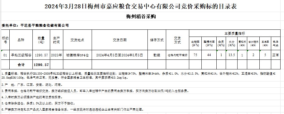 受客戶委托,梅州市嘉應(yīng)糧食交易中心有限公司定于2024年3月28日(星期四)舉辦糧食競價交易會。平遠(yuǎn)縣平糧糧食收儲有限公司擬采購2023年產(chǎn)早秈稻1290.57噸。