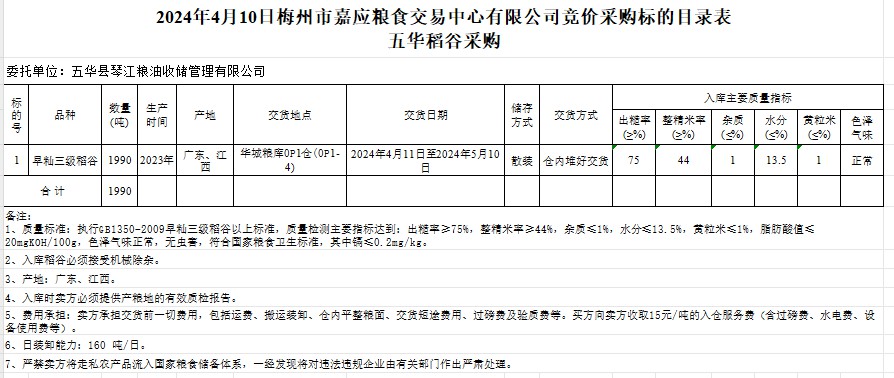 受客戶委托,梅州市嘉應(yīng)糧食交易中心有限公司定于2024年4月10日(星期三)舉辦糧食競(jìng)價(jià)交易會(huì)。五華縣琴江糧油收儲(chǔ)管理有限公司擬采購(gòu)2023年產(chǎn)早秈稻1990噸。