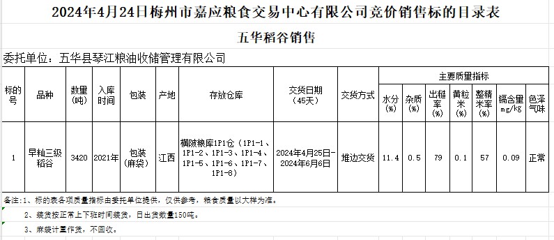 受客戶委托,梅州市嘉應(yīng)糧食交易中心有限公司定于2024年4月24日(星期三)舉辦糧食競(jìng)價(jià)交易會(huì)。五華縣琴江糧油收儲(chǔ)管理有限公司擬銷售2021年產(chǎn)早秈稻3420噸。