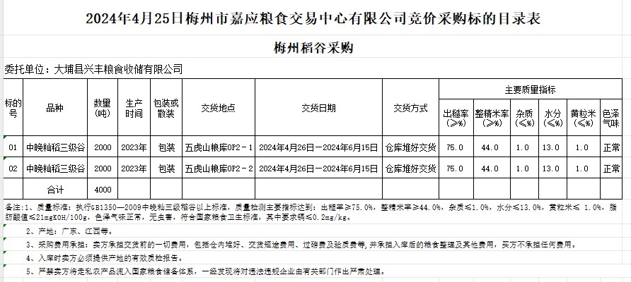 受客戶委托,梅州市嘉應(yīng)糧食交易中心有限公司定于2024年4月25日(星期四)舉辦糧食競(jìng)價(jià)交易會(huì)。大埔縣興豐糧食收儲(chǔ)有限公司擬采購(gòu)2023年產(chǎn)中晚秈稻谷4000噸。