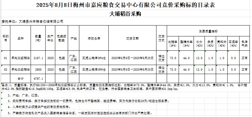 受客戶委托,梅州市嘉應(yīng)糧食交易中心有限公司定于2025年8月8日(星期五)舉辦糧食競價交易會。大埔縣興豐糧食收儲有限公司擬采購2025年產(chǎn)早秈稻谷4797.1噸。