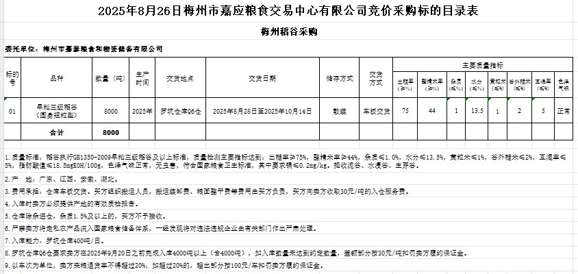 受客戶委托,梅州市嘉應糧食交易中心有限公司定于2025年8月26日(星期二)舉辦糧食競價交易會。梅州市嘉泰糧食和物資儲備有限公司擬采購2025年產(chǎn)早秈稻谷8000噸。