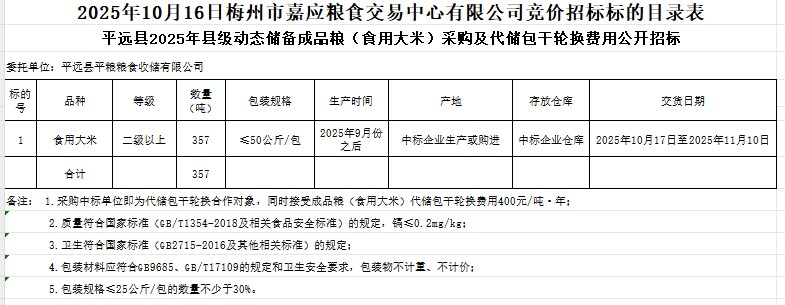 平遠縣2025年縣級動態(tài)儲備成品糧(食用大米)采購及代儲包干輪換費用公開招標(biāo)公告